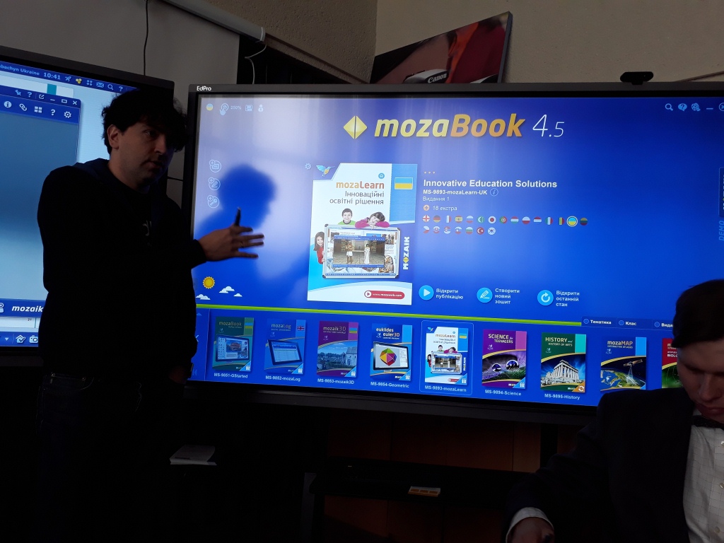 Співзасновник компанії EdPro Андрій Табачин познайомив присутніх із комплексним електронним освітнім ресурсом – платформою MOZAIK та mozaBook – інноваційним ПЗ для інтерактивної панелі чи дошки, які схвально зустрінуті педагогами та нині почали активно впроваджуватися в Україні. МozaBook урізноманітнює інструментарій для сучасного учителя за рахунок численних ілюстраційних, анімаційних і творчих презентаційних можливостей. Видовищні інтерактивні елементи і вбудовані додатки призначені для розвитку навичок, проведення дослідів і ілюстрування, пробуджують зацікавленість учнів і допомагають їм в більш легкому засвоєнні навчального матеріалу. Також було продемонстровано унікальний прилад, який став би в нагоді кожній школі – повноцінну цифрову міні-лабораторію Лабдиск, здатну за допомогою вмонтованих у пристрій датчиків швидко й точно вимірювати температуру, вологість, освітлення, рівень шуму тощо, а відтак може з успіхом використовуватись при вивченні практично всіх предметів початкової школи.