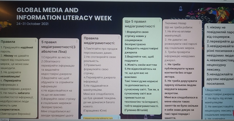що мав на меті допомогти учасникам протягом тижня сформувати медіаграмотні звички, що стануть частиною їхнього життя; онлайн-урок на тему: «Віртуальний та реальний світи: чи є межа?»; медіаграмотне чаювання для ліцейного активу «Блогери та соціальні мережі»; церемонія відкриття національного конкурсу для школярів «Репортер»; конкурс із написання есе на тему: “Я маю право на власну думку, але я не маю права на свої факти”. Кращі роботи підготували: Бурлака Назарій, Завгородня Вероніка, Заболотна Ліна – учні 9 класу та Дудник Інна й Крись Юлія – учениці 10-Б класу.