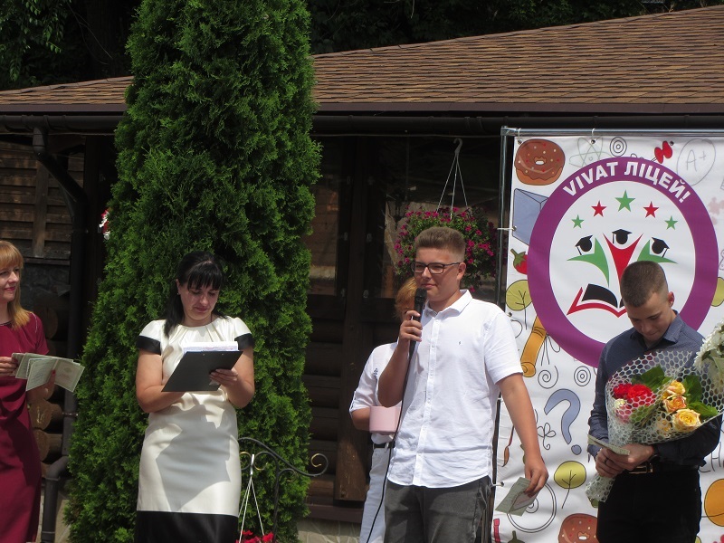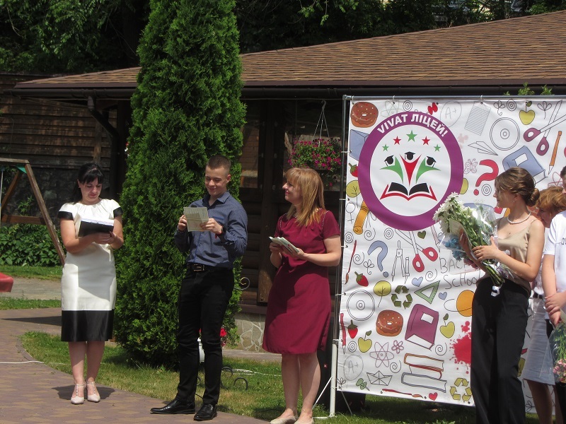З напутнім словом та словами вдячності до батьків звернулася директор ліцею Жанна Іванівна Здоренко, яка вручила учням і ученицям їх перші документи про освіту. Разом пригадали свої найяскравіші враження за 2 ліцейні роки. Від імені батьків виступила голова батьківського комітету класу Тетяна Іванівна Завгородня. Як оберіг в нинішні буремні дні класний керівник подарувала дітям символічних янголів-охоронців. З надією на мир і обов'язкову зустріч у 10 класі ліцею завершили свято ліричною піснею-побажанням миру всій нашій Україні.