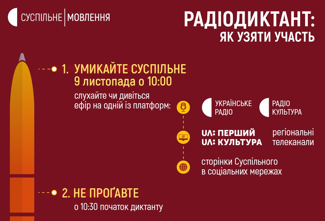 Диктант відбудеться 9 листопада о 10:00. Його транслюватимуть на всіх платформах Суспільного мовлення (телеканали, радіо та сторінки у соцмережах):