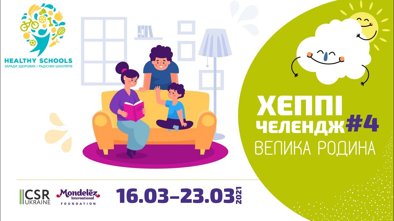 Триває 4 тиждень Хеппі челенджу #Велика родина проєкту Healthy Schools: заради здорових і радісних школярів. Мета цього тижня - згуртувати дітей з їх батьками, посприяти емоційному зближенню всередині родин, а також підсилити почуття приналежності у дітей до їх великої шкільної родини і до своєї місцевої громади. Всі великі справи починаються із першого кроку, а найважливіші зміни відбуваються у нашому серці.