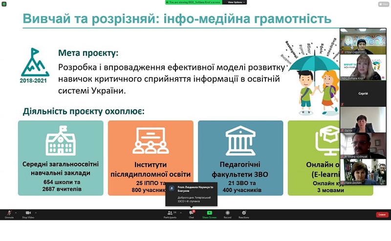 17 березня відбулася інформаційна зустріч щодо впровадження проєкту «ВИВЧАЙ ТА РОЗРІЗНЯЙ: ІНФО-МЕДІЙНА ГРАМОТНІСТЬ» у Черкаській області учасниками якого є й вчителі та учні 8-10-х класів Городищенського економічного ліцею.