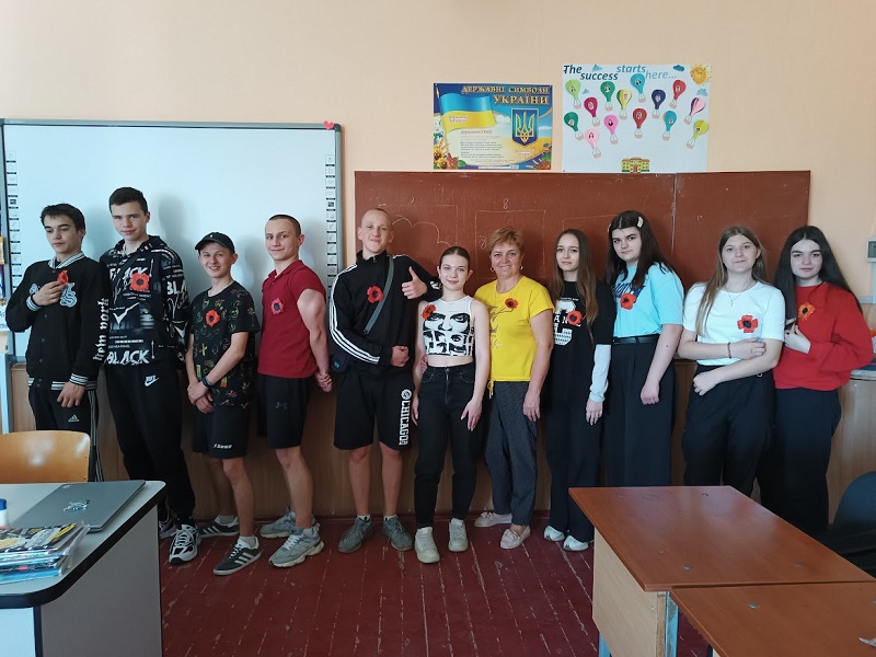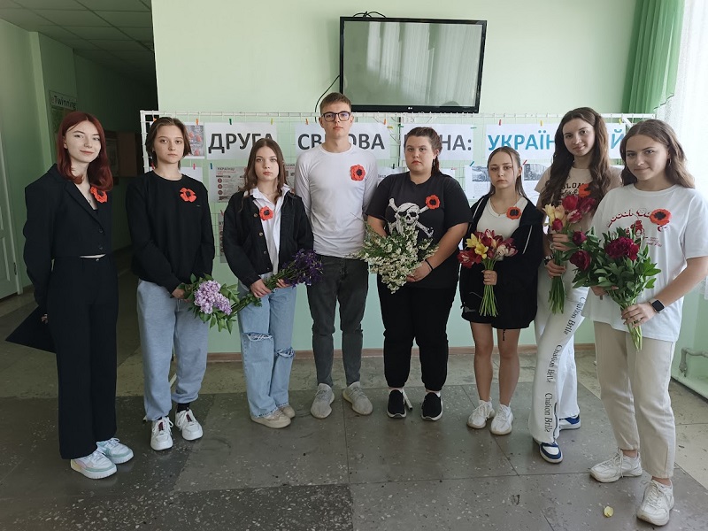 Представники учнівського самоврядування (старости класів) разом із соціальним педагогом Вікторією Володимирівною Панько поклали квіти до монументу Слави. З творчою ініціативою виступили також учні 9-х класів, які спільно і під керівництвом вчителя біології Оксани Євгенівни Марченко виготовили атрибути пам'яті - червоні маки. Таким чином ми доєдналися саме до європейської традиції відзначення Дня перемоги і пам'яті саме 8 травня, що була започаткована після Революції гідності і є одним із важливих аспектів декомунізації нашої історичної пам'яті.