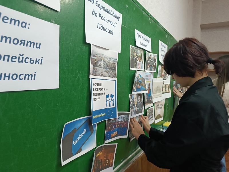 У 8-10-х класах проведено інтерактивні заняття, під час яких учні міркували над змістом поняття «гідність» та зв’язок між гідністю і демократичними цінностями і правами людини. В 11-х класах було проведено заняття у формі віртуальної фотовиставки «Сторінками історії Революції гідності». Під час заходів учнівству пропонувалося провести мінідослідження фотодокументів та провести їх аналіз за визначеними темами. Окремо звернули увагу на вивчення масштабів Революції Гідності та поміркували над тим, які саме революційні зміни в свідомості сучасних українців зафіксували події зими 2013-2014 рр. Визначили, що, окрім повалення злочинного режиму Януковича, справді революційним було утвердження в суспільній свідомості ідеї цінності прав людини, цінностей демократії та гідності як невід’ємної ознаки сучасної людини в демократичному суспільстві.